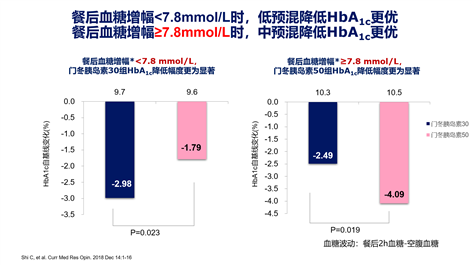 需要强调的是,这项研究19重新定义了中国T2DM患者适合低/中预混胰岛素起始的治疗切点:即仅在基线血糖增幅≥7.8mmol/L或餐后2小时血糖≥17.6 mmol/L患者中,中预混胰岛素才显现出优势(图1&图2)。