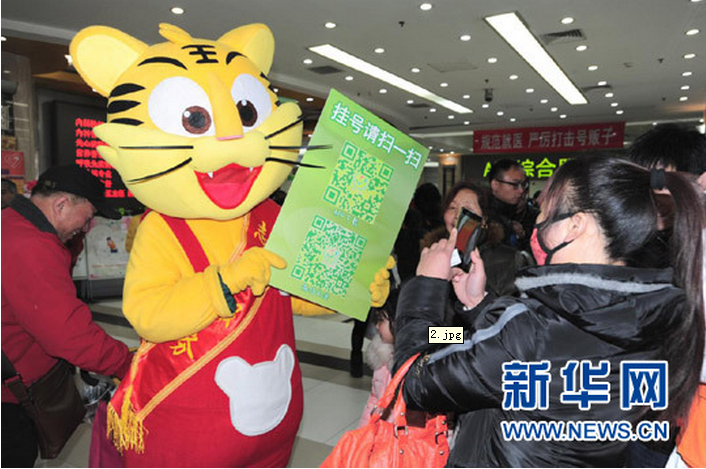 北京儿童医院推行非急诊挂号全面预约,身穿卡通人物服装的志愿者在门诊大厅现场推广手机APP预约挂号。(资料图)